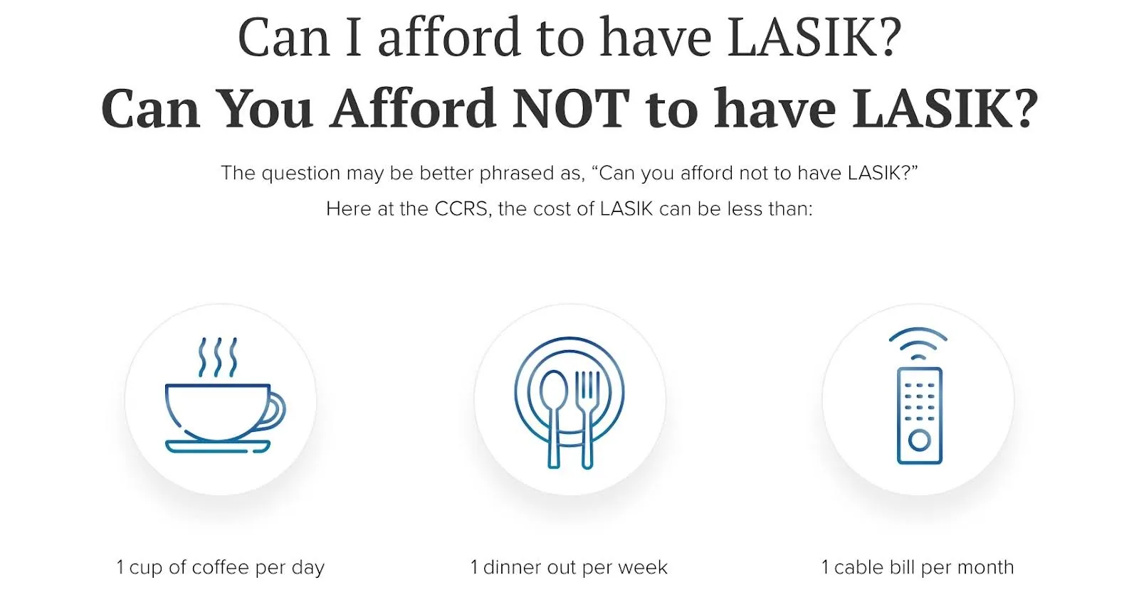 At CCRS, we are committed to making LASIK an affordable option for you. We are confident that no one can offer better pricing and will price match* anyone who offers LASIK using the same advanced technology and provides the same aftercare service. Please be sure to ask about our no-interest finance option. We look forward to seeing you.